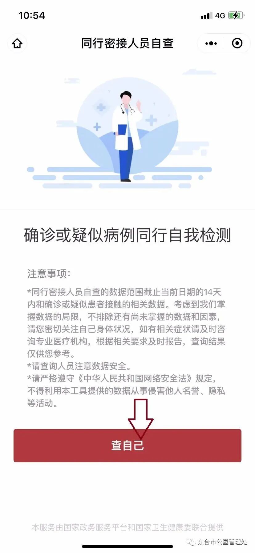 2.弹出“确诊或疑似病例同行自我检测”内容,点击“查自己”;